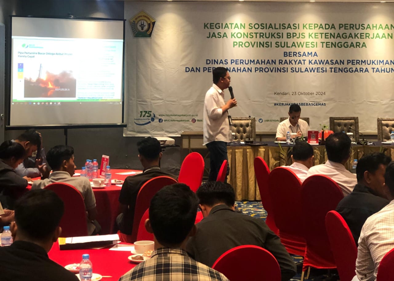 KOLOMRAKYAT.COM: KENDARI – Badan Penyelenggara Jaminan Sosial (BPJS) Ketenagakerjaan atau BP Jamsostek Cabang Kendari, bersama Pemerintah Provinsi Sulawesi Tenggara, menggelar sosialisasi program perlindungan untuk sektor Jasa Konstruksi di salah satu hotel di Kendari, Rabu (23/10/2024).