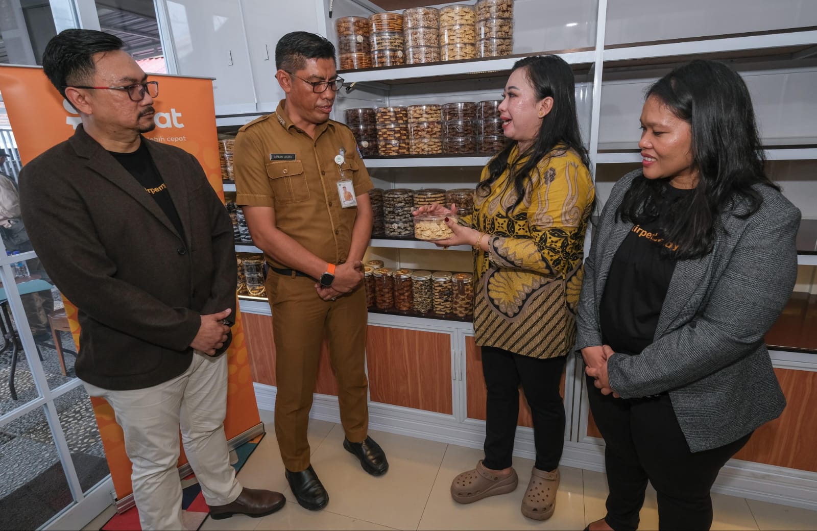 Ibu Sheila (kemeja kuning) menunjukkan usaha Kue Keringnya dari etalase kepada Sekcam Mandonga dan Pimpinan BTPN Syariah. (Foto: Ist/KR)