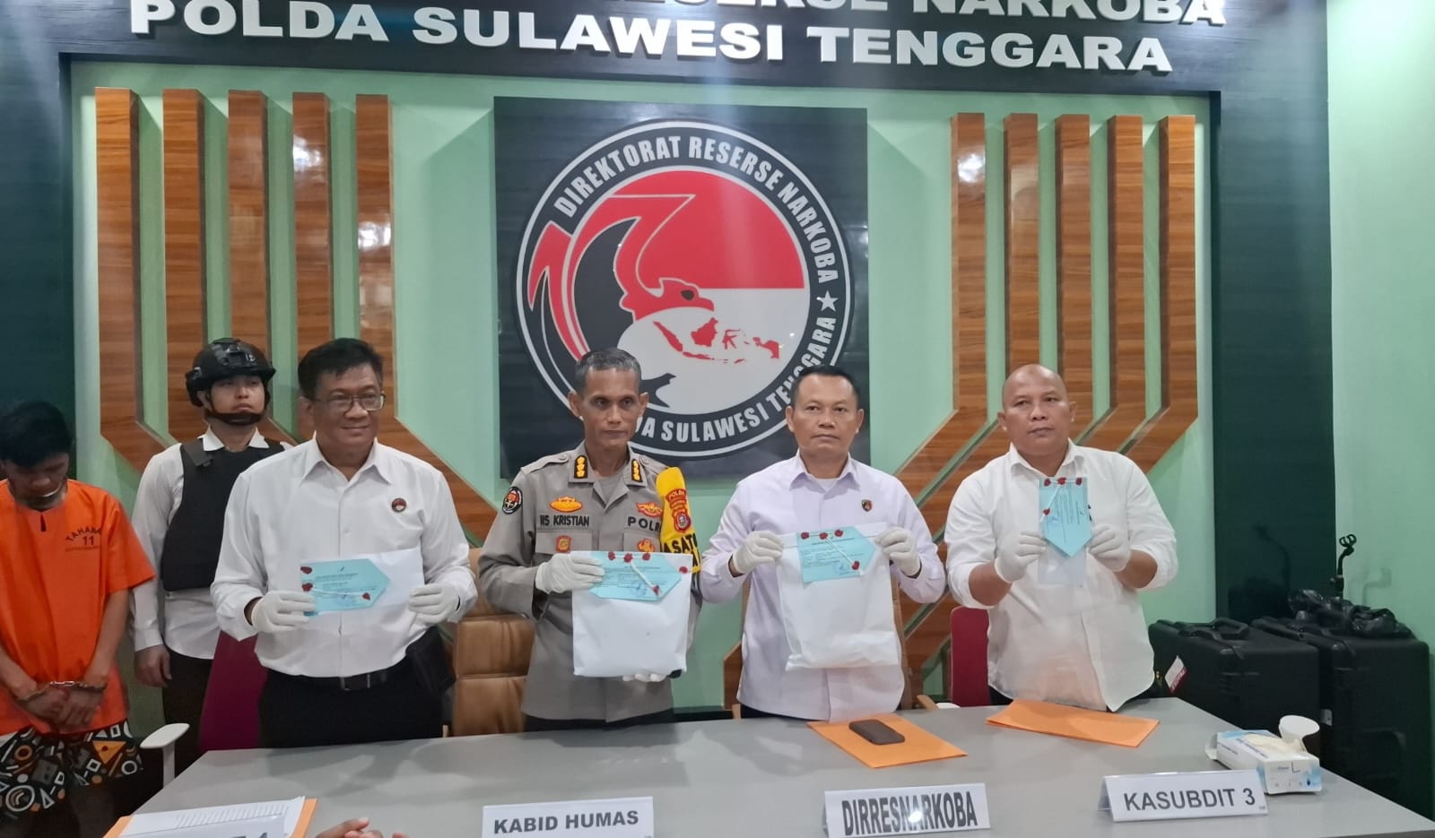 Konferensi ini dipimpin langsung oleh Dirnarkoba Kombes Pol. Bambang Sukmo Wibowo, S.IK., S.H., M.Hum, didampingi Kabid Humas Polda Sultra Kombes Pol Iis Kristian, S.IK.