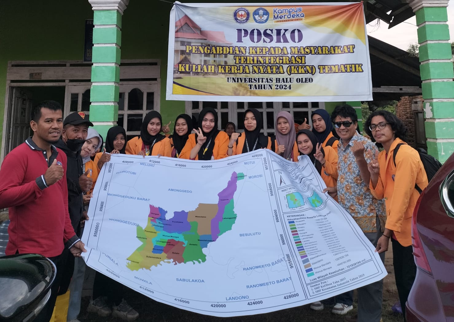 Mahasiswa peserta KKN Tematik Prodi Teknik Geofisika UHO bersama Tim Dosen Pendamping menyerahkan peta batas Desa Amesiu dan peta batas Kecamatan Pondidaha pada saat penarikan mahasiswa KKN. (Foto: Ist/KR)