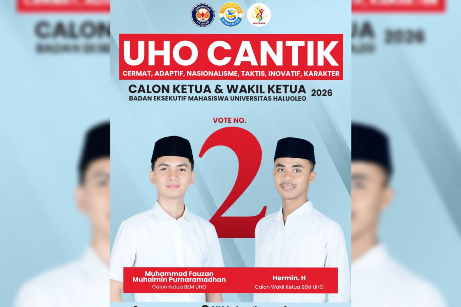 KOLOMRAKYAT.COM: KENDARI – Universitas Halu Oleo (UHO) bersiap untuk memilih pemimpin baru Badan Eksekutif Mahasiswa (BEM) pada Tahun 2026. Salah satu pasangan calon yang mencuri perhatian adalah Muhammad Fauzan Muhaimin Purnaramadhan dan Hermin H yang mengusung visi “UHO Cantik.”