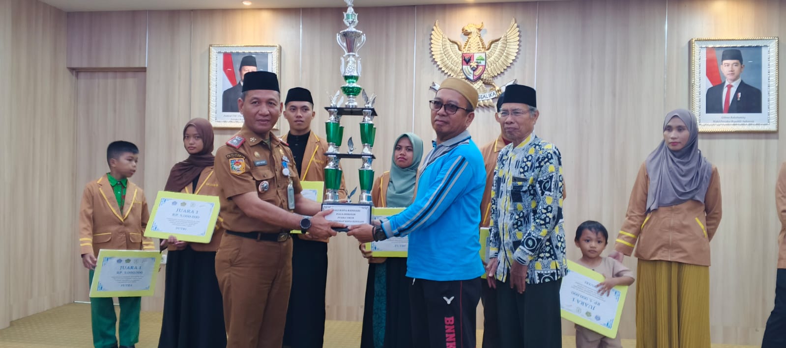 Penyerahan piala bergilir kepada Kecamatan Baruga sebagai juara umum pelaksanaan MTQ Tingkat Kota Kendari ke XXXI. (Foto: Hasrul/KR)