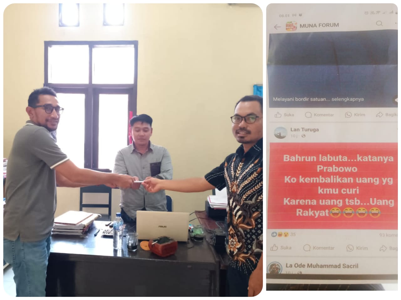 Melalui akun Facebooknya Lan Turuga telah memposting atau menulis status di beranda akunnya serta telah membagikannya di grup FB Muna Forum dengan caption “Bahrun Labuta katanya Prabowo Ko kembalikan uang yg kmu curi karena uang tsb…uang Rakyat” diakhiri emotikon ketawa.