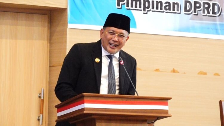 Pj Wali Kota Kendari, Muhammad Yusup saat menyampaikan sambutannya pad pelantikan Ketua dan Wakil Ketua DPRD Kota Kendari periode 2024-2029 di Aula Paripurna Gedung DPRD Kota Kendari. (Foto: Ist/KR)