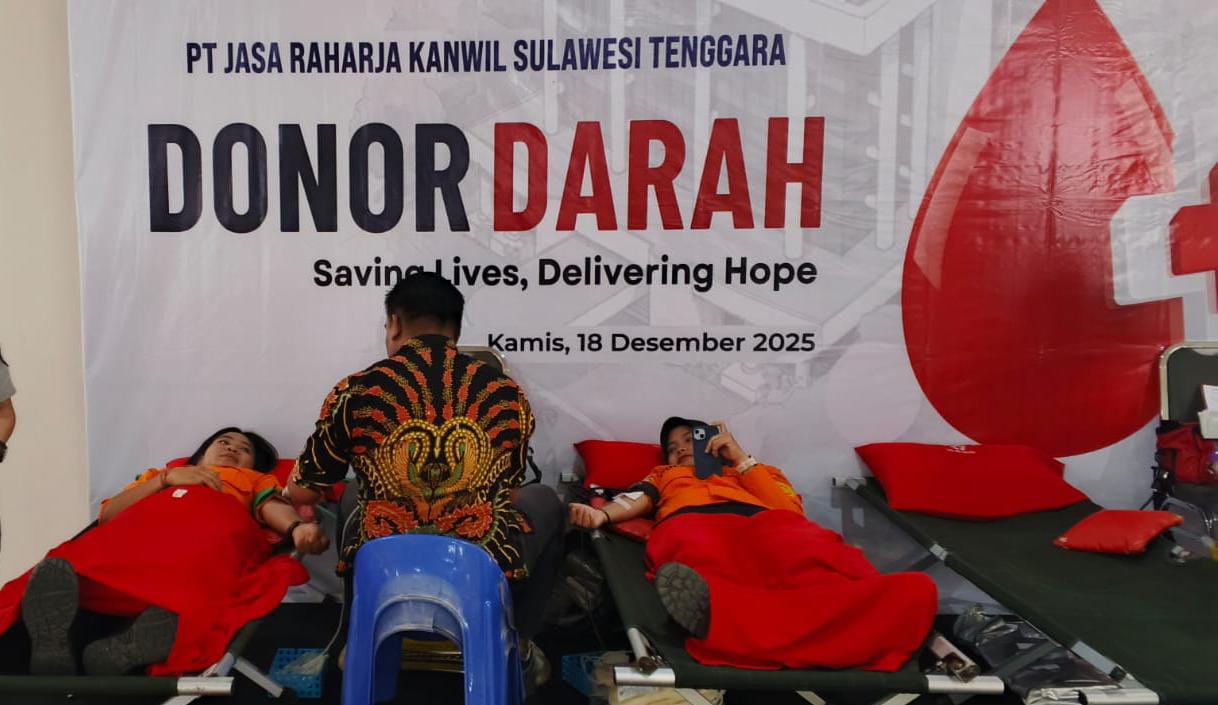 KOLOMRAKYAT.COM: KENDARI – Dalam rangka menyambut Hari Ulang Tahun (HUT) ke-65, PT Jasa Raharja Kanwil Sulawesi Tenggara (Sultra) menggelar aksi kemanusiaan donor darah di Kantor Jasa Raharja, Kecamatan Mandonga, Kamis (18/12/2025).