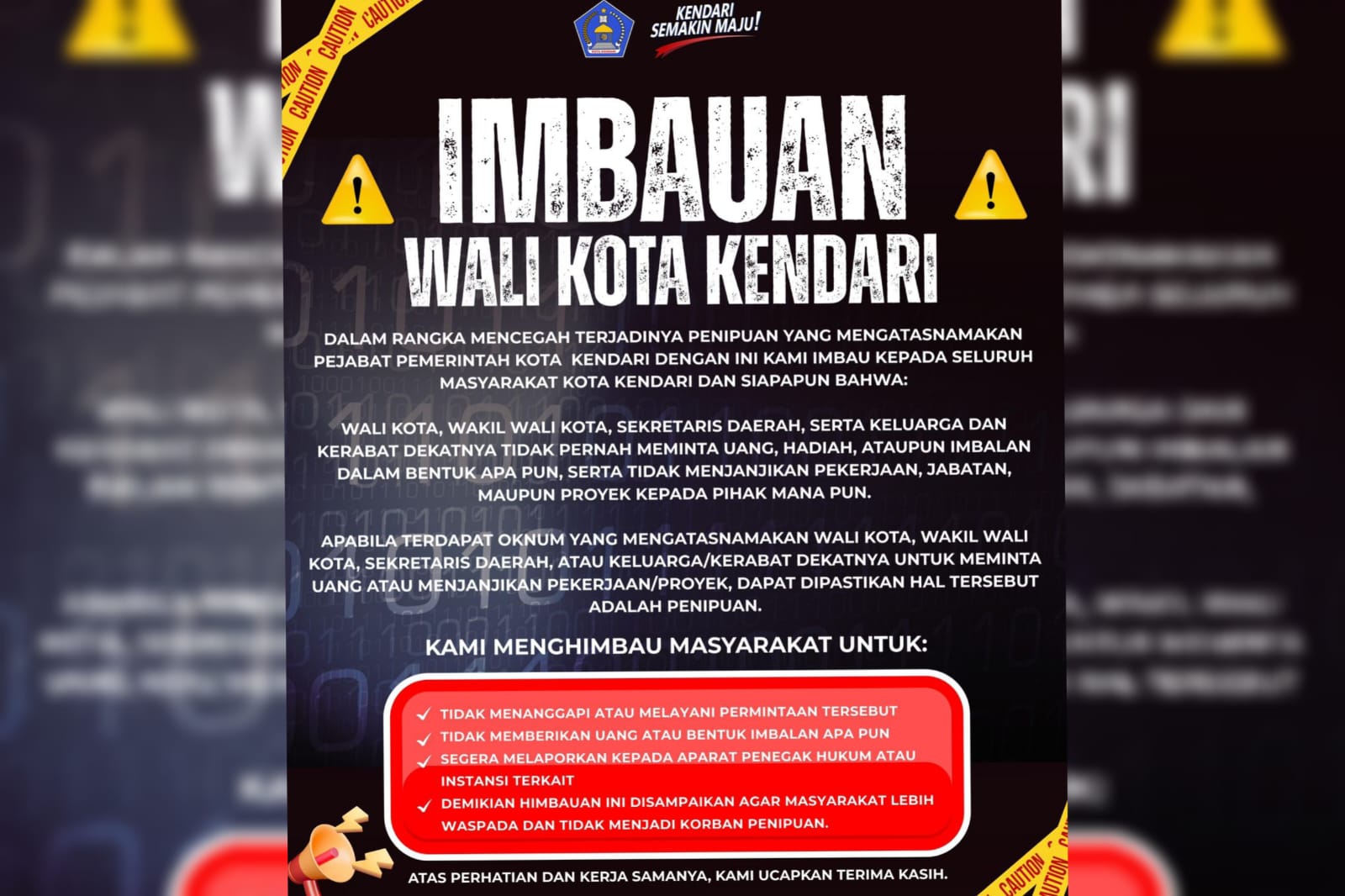 “Apabila terdapat oknum yang mengatasnamakan pejabat atau keluarga/kerabat dekatnya untuk melakukan hal tersebut, dipastikan merupakan tindakan penipuan,” tulis Wali Kota Kendari, dalam imbauannya.